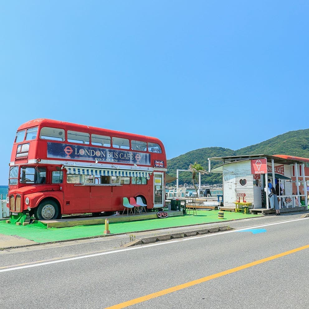 志摩サンセットロード沿いにある、可愛いロンドンバスカフェはジェラートが魅力的。バス内にイートインスペースもあります。