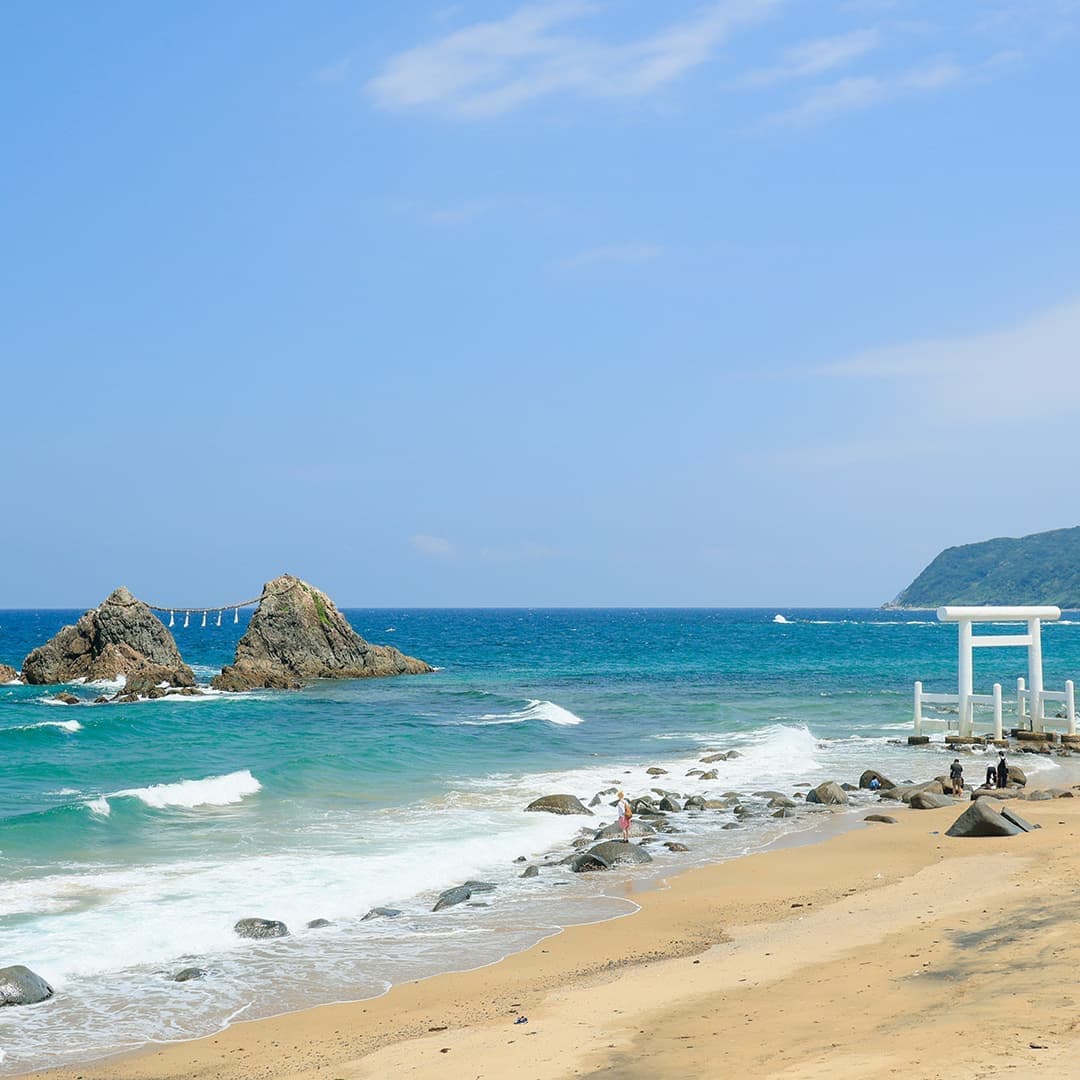 二見ヶ浦は玄海国定公園内に位置し、桜井神社によって伊弉諾と伊弉冉が祀られています。海岸から約150m離れた海中に夫婦岩があり、夫婦岩の前の海中には白い鳥居が立っています。